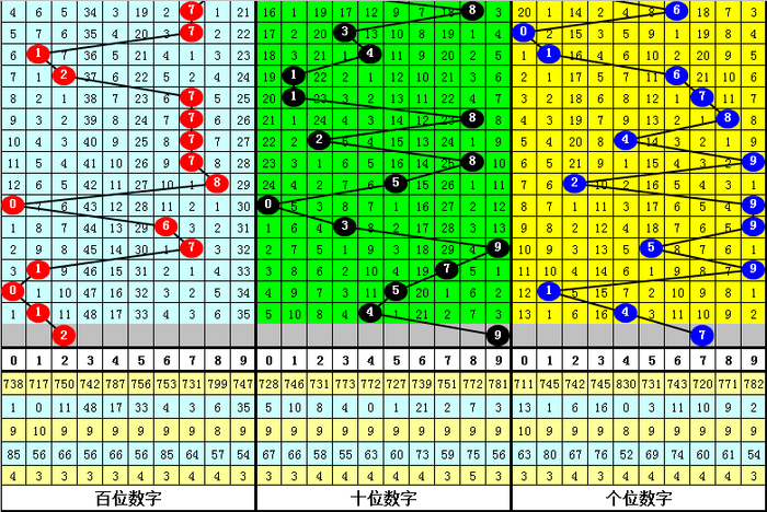 3.在以上9期奖号中,号码012路比辞别开出2:1:0、0:1:2、1:1:1、1:0:2、2:1:0、0:0:3、0:1:2、2:0:1、1:1:1,012路出现个数比为9:6:12,本期预测开出012路比1:1:1。