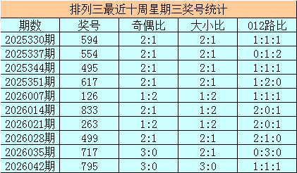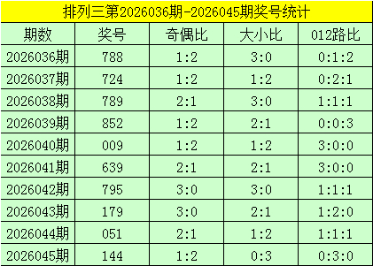 开奖转头:陈设三第2026045期奖号为:144,其奇偶比为1:2,大小比为0:3,奖号012路比为0:3:0。