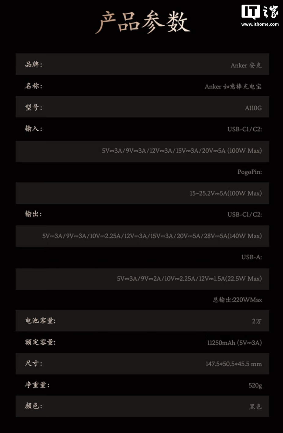 该居品相通选拔立体浮雕工艺及定制充电界面,顶部带有 1 个 USB-A 接口、2 个 USB-C 接口,其中 USB-C 接口撑握 140W 输出 / 100W 输入、USB-A 接口撑握 22.5W 输出、三个接口缠绵可达成 220W 峰值输出。