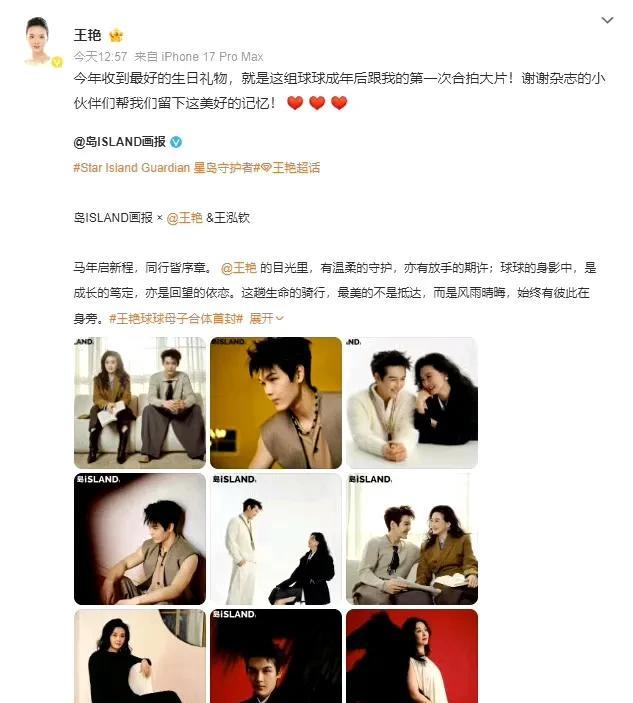 2026年2月11日,是演员王艳52岁的生辰。在她生辰的前一天,也即是2月10号,王艳与犬子球球初次合体拍摄杂志大片。子母二东谈主统共登上《岛ISLAND画报》,拍摄了一组“骐遇新程”主题大片。王艳发文说,“本年收到的最佳的生辰礼物,即是这组球球成年后跟我的第一次合拍大片。”