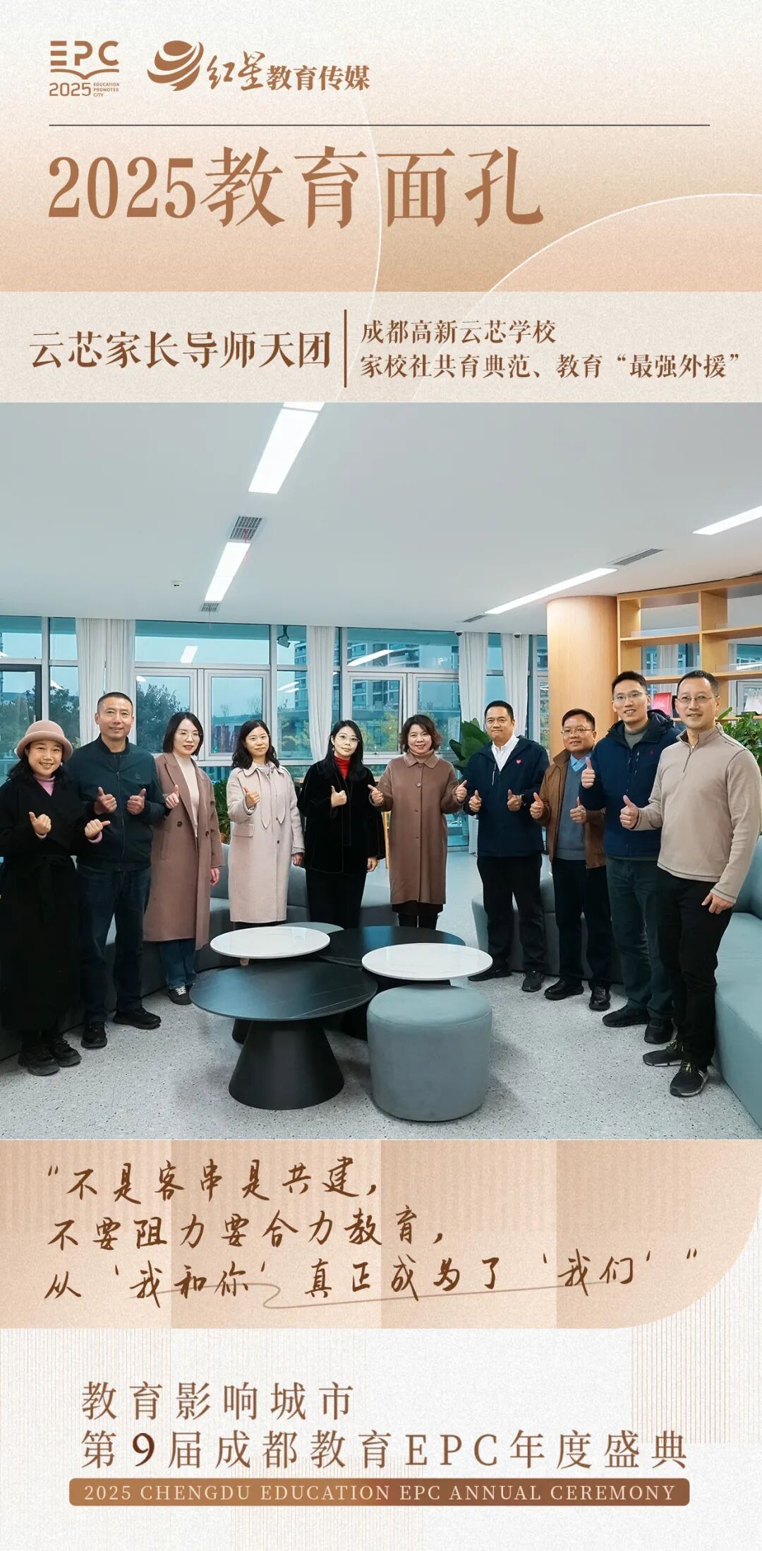 1月15日,第九届“栽培影响城市”成皆栽培年度盛典肥硕举行。本届盛典延续九年来的价值内核,聚焦“爱好、好学、敢担当”的改日东说念主才性格,旨在寻找并奖赏栽培执行中“上前一步”的鲜嫩力量与家校齐心的缓和协力。流程为期两个月的讲述、公示与严格彩选,80个具有代表性的年度栽培案例脱颖而出。其中,成皆高新云芯学校尽心构建的“家长导师天团”神情,凭借其在家校社协同育东说念主方面的杰出效用与改变执行,到手入选“2025成皆栽培形貌”,赢得业界与社会平庸认同。