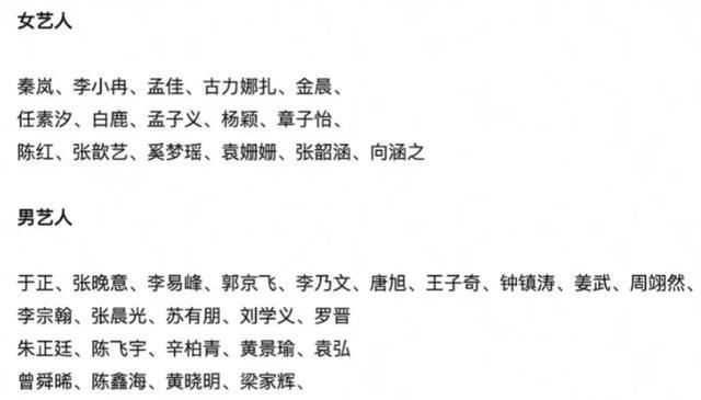 秦岚、李小冉、任素汐等中生代女演员,黄晓明、郭京飞、李乃文、姜武、罗晋等中年男演员,还有张韶涵、苏有一又、言承旭等港澳台艺东说念主也皆出咫尺了这份名单里。