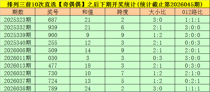 开奖转头:罗列三第2026045期开出奖号:144,类型为组三,和值为9,奇偶比为1:2,大小比为0:3,跨度为3。 罗列三上期奖号为144,开独特偶类型为【奇偶偶】,前10次【奇偶偶】类型奖号鉴识开出:148、980、164、900、126、920、522、786、788、724; 1.有3期奖号和值与上期奖号和值换取。 2.有1期奖号跨度与上期奖号跨度换取。 3.在前10次【奇偶偶】类型奖号开出之后,其下期奖号鉴识开出:677、999、900、255、599、000、477、700、744