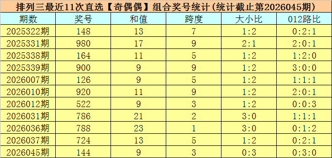 开奖转头:罗列三第2026045期开出奖号:144,类型为组三,和值为9,奇偶比为1:2,大小比为0:3,跨度为3。 罗列三上期奖号为144,开独特偶类型为【奇偶偶】,前10次【奇偶偶】类型奖号鉴识开出:148、980、164、900、126、920、522、786、788、724; 1.有3期奖号和值与上期奖号和值换取。 2.有1期奖号跨度与上期奖号跨度换...